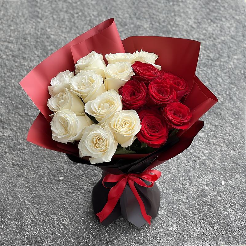 This bouquet is a romantic narrative woven with devotion and purity. The white roses, like condensed moonlight, symbolize a love that is pure and flawless. The red roses, like blazing flames, speak of passionate and sincere affection. Wrapped in mysterious red and black, with a red ribbon like a melodic highlight, they compose a symphony of love together. Each petal softly whispers deep longing and endless admiration.